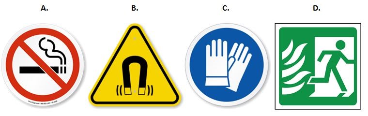 Sign B - The answer for sign B is “warning, strong magnetic fields.” The yellow color of the sign means caution, the triangular shape means warning, and the magnet with the field lines means strong magnetic fields.
